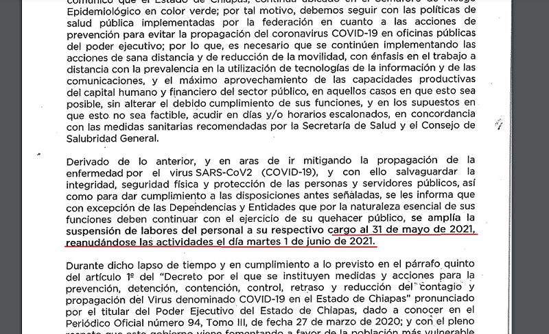 Tuxtla Gutiérrez, Chiapas; 14 de mayo de 2021 (muralchiapas.com).- El Gobierno del Estado de Chiapas determinó la ampliación de suspensión de servicios del sistema publico estatal al considerar que aún se encuentran en riesgo latente de contagios por el virus SarsCov2 mejor conocido como el Conornavirus o Covid19.