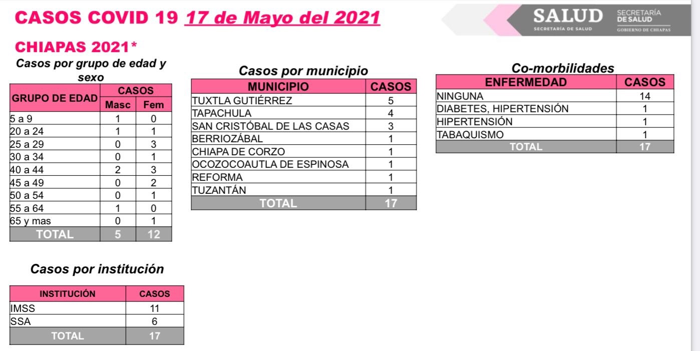 Tuxtla Gutiérrez, Chiapas; 17 de mayo de 2021.- Chiapas cumple 96 horas sin registrar fallecimientos por COVID-19, mientras que en incidencia de casos se notificaron 17 contagios el último día, informa la Secretaría de Salud estatal.
