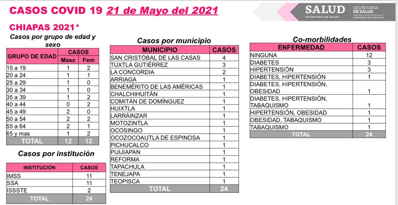 Tuxtla Gutiérrez, Chiapas; 21 de mayo de 2021.- La Secretaría de Salud de Chiapas comunica que en las últimas horas se notificaron 24 contagios de COVID-19, sin reportarse decesos por esta enfermedad.