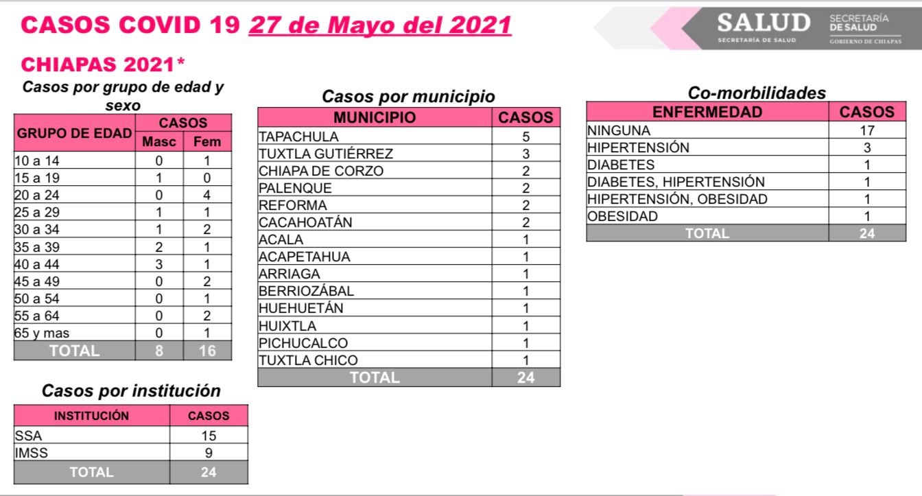 Tuxtla Gutiérrez, Chiapas; 27 de mayo de 2021.- El Laboratorio Estatal de Salud Pública confirmó en las últimas horas 24 casos positivos de COVID-19. En cuanto a los decesos por esta enfermedad, la Secretaría de Salud de Chiapas comunica el reporte de una muerte en el último día.