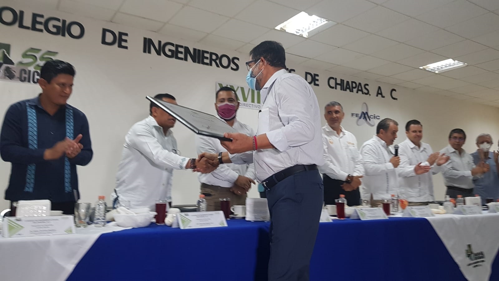Tuxtla Gutiérrez, Chiapas; 20 de octubre de 2021.- Subrayando que la ingeniería civil chiapaneca está a la altura de la de cualquier parte del mundo, el Colegio de Ingenieros Civiles de Chiapas (CICCH), entregó reconocimientos a dos de sus agremiados, luego de ser galardonados con el Premio Obras CEMEX 2021 en la categoría de Infraestructura por su desempeño profesional en el hermano país de El Salvador, siendo esto una inspiración para el gremio y evento de referencia por su trabajo, esfuerzo y dedicación.