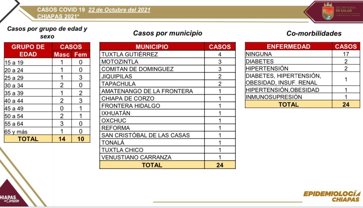 Tuxtla Gutiérrez, Chiapas; 22 de octubre de 2021.- El informe diario sobre la transmisión de COVID-19 en la entidad indica que en las últimas horas se confirmaron 24 contagios en 15 municipios, así como una defunción en personas de 34 años de edad, da a conocer la Secretaría de Salud de Chiapas.