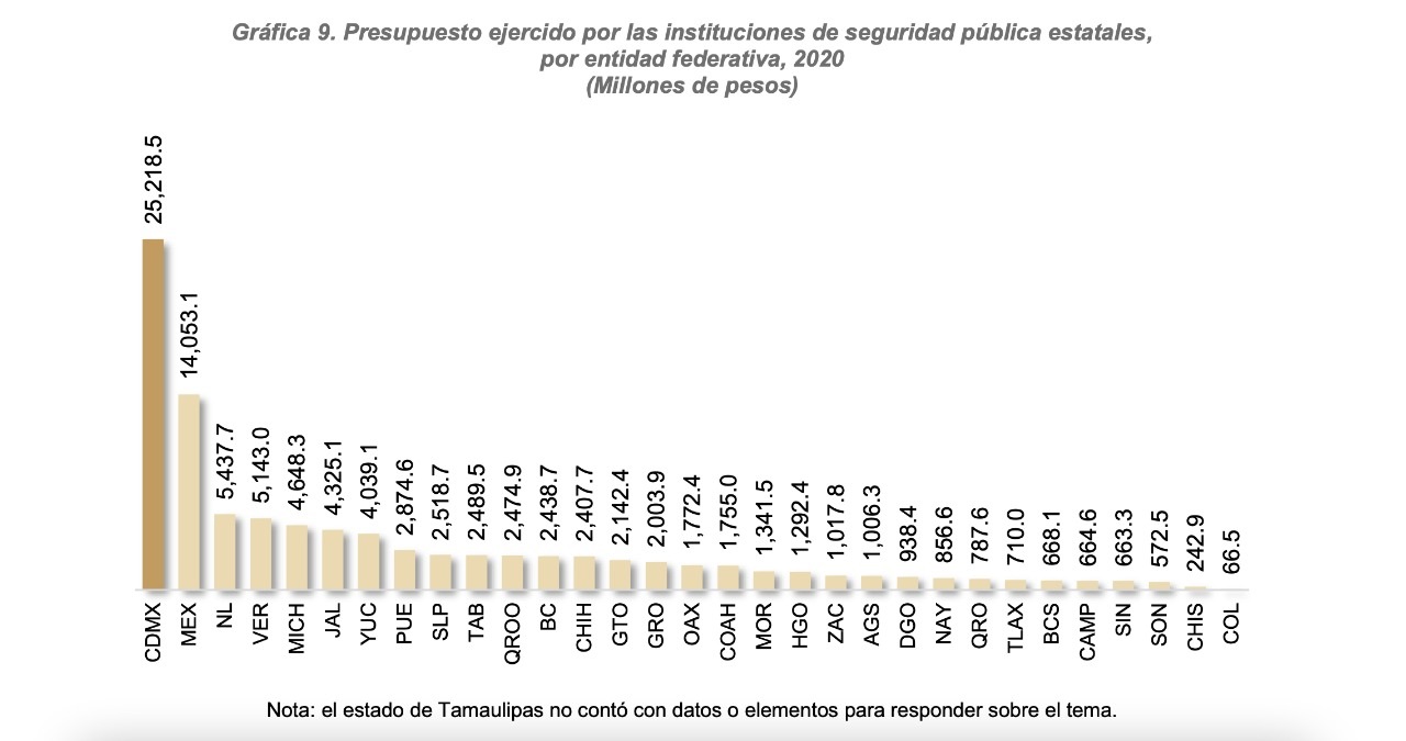 En contraparte, la encuesta destaca que los estados de Colima y Chiapas fueron las entidades que menos presupuesto contaron para las actividades de seguridad pública, al reportar un presupuesto ejercido de 66.5 millones de pesos y 242.9 millones de pesos, respectivamente.