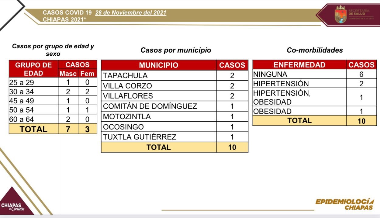 Los casos recientes se registraron en los siete municipios siguientes: Tapachula, Villa Corzo y Villaflores, dos cada uno; y Comitán, Motozintla, Ocosingo y Tuxtla Gutiérrez, un contagio cada uno.