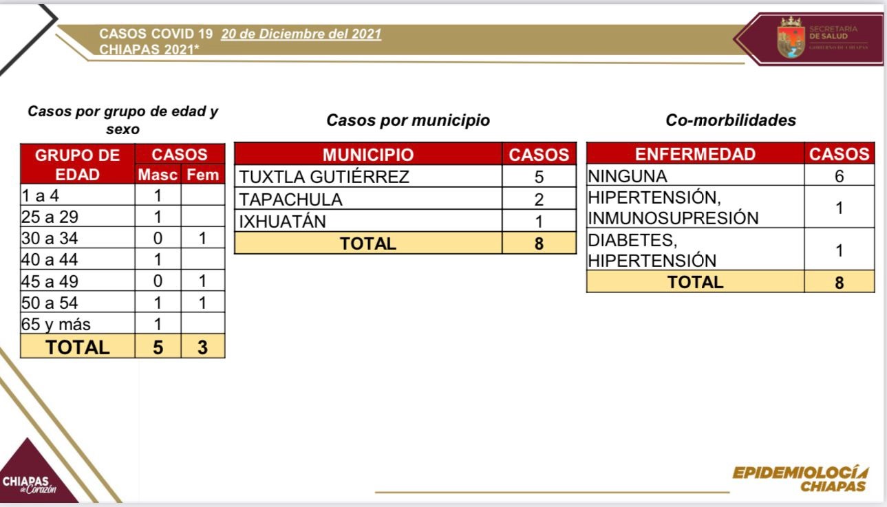 Tuxtla Gutiérrez, Chiapas; 20 de diciembre de 2021.- El Laboratorio Estatal de Salud Pública reporta que, en las últimas horas, ocho pruebas analizadas salieron positivas a COVID-19, una de ellas corresponde a un menor de edad.