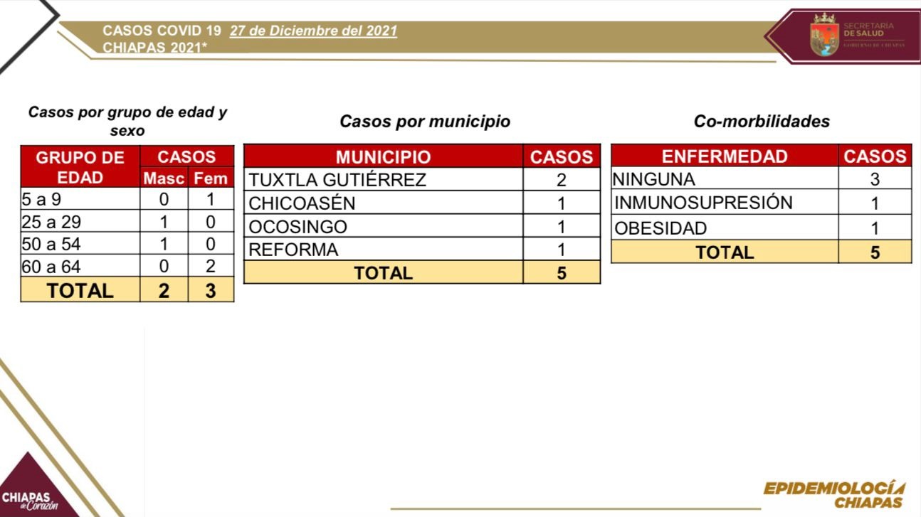 Tuxtla Gutiérrez, Chiapas; 27 de diciembre de 2021.- Al empezar la semana número 46 en semáforo verde, el estado de Chiapas registró cinco casos positivos de COVID-19, sin fallecimientos, en las últimas horas, informa la Secretaría de Salud estatal.