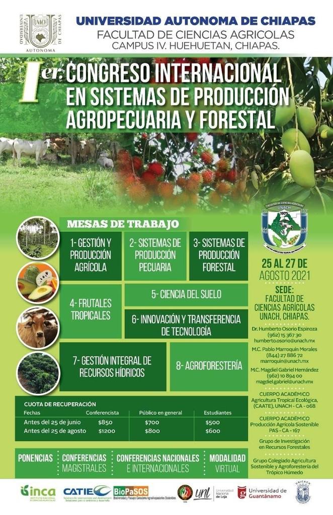Tuxtla Gutiérrez, Chiapas; marzo 19 de 2021.- Con el objetivo de cumplir con su misión institucional de promover la enseñanza e investigación de las ciencias agrícolas, basándose en el uso sostenible de los recursos naturales de la región Soconusco e Istmo-Costa, tendientes a mejorar el bienestar de la población tropical de México, la Facultad de Ciencias Agrícolas de la Universidad Autónoma de Chiapas, organiza el Primer Congreso Internacional en Sistemas de Producción Agropecuaria y Forestal.