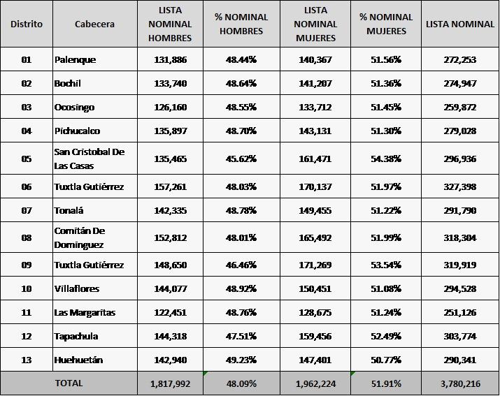 Por distrito electoral, el INE destacó que el 01 y 09 con cabecera en Tuxtla Gutiérrez son los que concentran la mayor cantidad de votantes con 327 mil 398 y 319 mil 919 ciudadanos y ciudadanas, respectivamente.