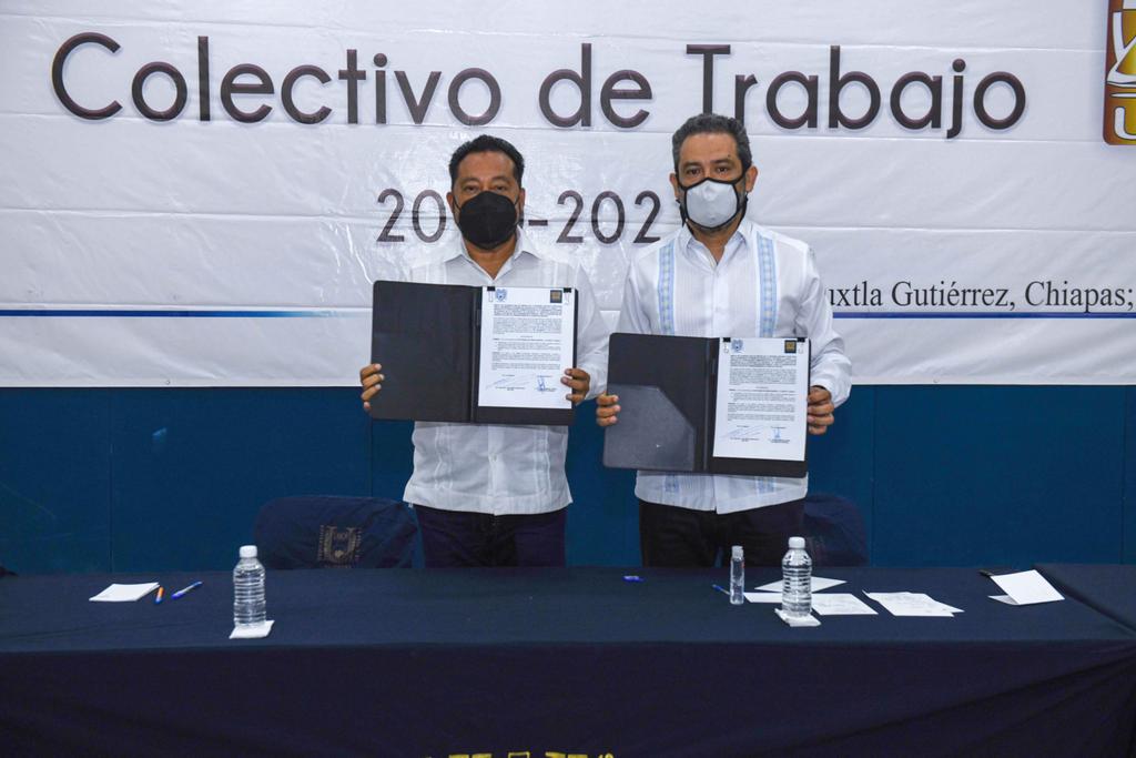 Tuxtla Gutiérrez, Chiapas; mayo 13 de 2021. - Con un acuerdo de aumento del 3.4 por ciento directo al salario y de 0.9 por ciento en prestaciones, la administración central de la Universidad Autónoma de Chiapas, encabezada por el rector Carlos F. Natarén Nandayapa y el Sindicato de Trabajadores Administrativos (STAUNACH), representado por su secretario General, Pedro Jiménez Pérez, firmaron el Contrato Colectivo de Trabajo 2021.