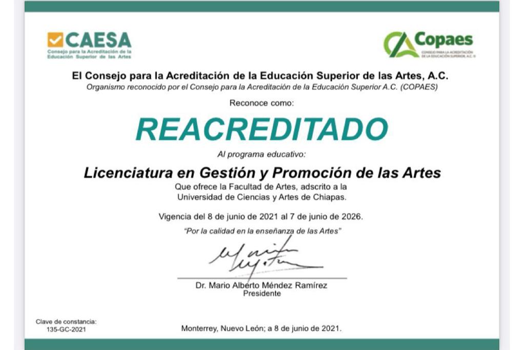 El programa educativo ha sido nuevamente acreditado por el Consejo de la Acreditación de la Educación Superior de las Artes, A. C., lo que ratifica su calidad académica y administrativa, y la avala por cinco años más.