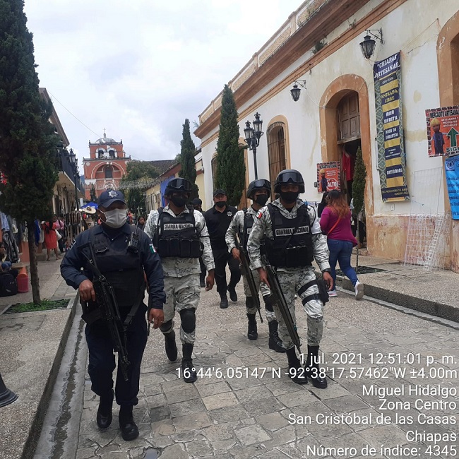 San Cristóbal de Las Casas, Chiapas. 01 de julio de 2021.- En seguimiento a operativos de verificación que autoridades municipales y estatales están realizando en diversos establecimientos del Centro Histórico, así como en barrios y colonias, la Dirección de Policía Municipal informó que desde la mañana de este miércoles se activó el Operativo Escudo Titán, en el que participan elementos de la Guardia Nacional, Secretaría de la Defensa Nacional, Policía Estatal Preventiva y Tránsito Municipal, mediante el cual se mantiene estricta vigilancia para garantizar el orden y la tranquilidad en todo el municipio.