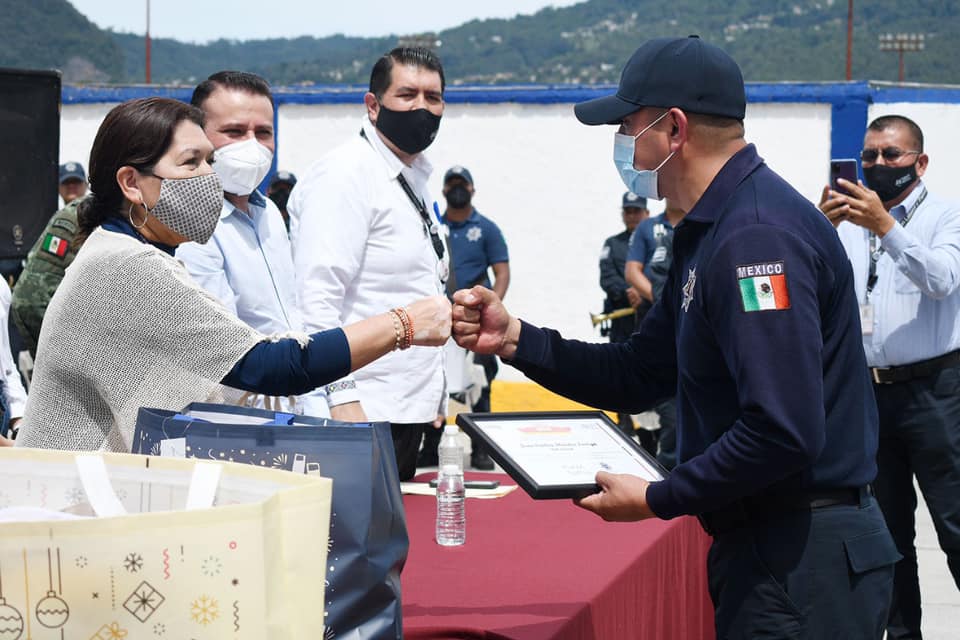 Tras encabezar la entrega de reconocimientos a 40 policías municipales y uniformes tácticos a 30 ciudadanos vigilantes, la alcaldesa agradeció el respaldo del Presidente Andrés Manuel López Obrador y del Gobernador Rutilio Escandón, quienes son aliados permanentes de San Cristóbal de Las Casas y lo refrendan todos los días con el apoyo de instituciones federales y estatales para que podamos vivir con paz y tranquilidad.