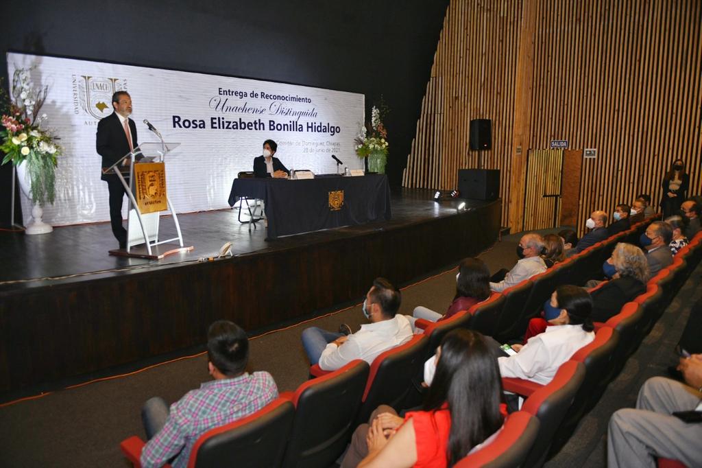 Comitán, Chiapas; Junio 28 de 2021.- En honor a su trayectoria profesional, sus contribuciones para el fortalecimiento de la vida académica e institucional, la Universidad Autónoma de Chiapas entregó el Reconocimiento como Unachense Distinguida, a la diputada Rosa Elizabeth Bonilla Hidalgo.