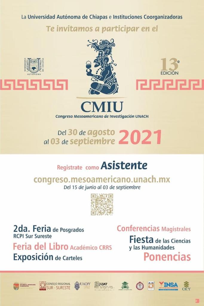 Tuxtla Gutiérrez, Chiapas; julio 20 de 2021.- Con el objetivo de divulgar los resultados de investigaciones científicas, tecnológicas, humanísticas y de innovación en las diferentes áreas del conocimiento, compartidos por la comunidad científica de distintos países, la Universidad Autónoma de Chiapas, organiza la décimo tercera edición del Congreso Mesoamericano de Investigación UNACH (CMIU), el cual se llevará a cabo del 30 de agosto al 3 de septiembre del 2021.
