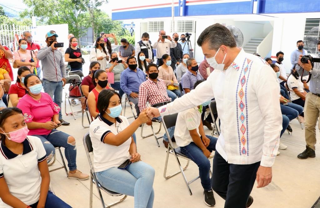 Tuxtla Gutiérrez, Chiapas; 02 de agosto de 2021.- Como parte del compromiso de abatir el rezago en materia de infraestructura educativa, para que las y los estudiantes cuenten con espacios dignos, el gobernador Rutilio Escandón Cadenas inauguró el Centro de Educación Media Superior a Distancia (EMSaD) 282, en el municipio de Osumacinta, donde reafirmó que estas acciones son una muestra de que la entidad se está preparando para iniciar las clases presenciales el próximo ciclo escolar.