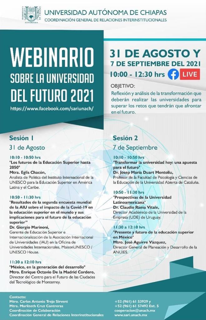 Tuxtla Gutiérrez, Chiapas; agosto 10 de 2021.- La Universidad Autónoma de Chiapas (UNACH), a través de la Coordinación General de Relaciones Interinstitucionales, presentará los días 31 de agosto y siete de septiembre del presente año, el Webinario sobre la Universidad del Futuro 2021.