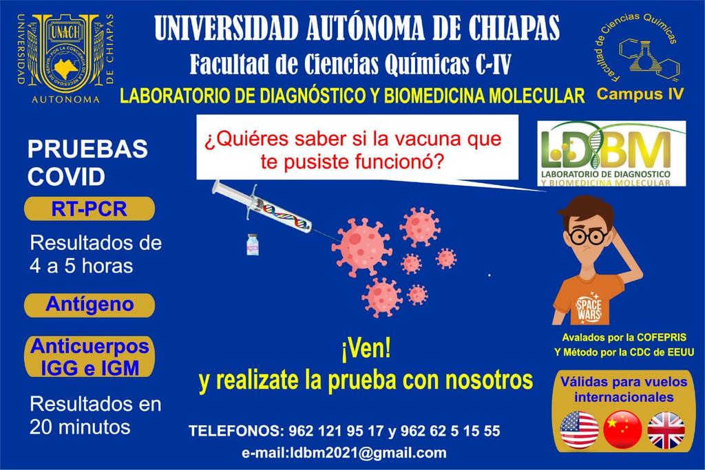 Las pruebas de Covid-19 son RT-PCR, con resultados de 4 a 5 horas; asimismo las de Antígeno; Anticuerpos IGG e IGM, con resultados en 20 minutos, teniendo costos accesibles al público, además de que están avaladas por la COFEPRIS y Método por la CDC de Estados Unidos.