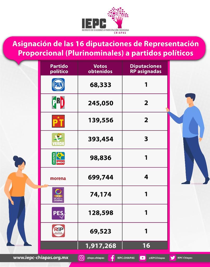 El consejero electoral Guillermo Rojo Martínez, presidente de la Comisión Permanente de Asociaciones Políticas, explicó que primero se asignó una diputación a los nueve partidos que obtuvieron por lo menos el 3% de la Votación Válida Emitida: Partido Acción Nacional (PAN), Partido Revolucionario Institucional (PRI), Partido del Trabajo (PT), Partido Verde Ecologista de México (PVEM), Partido Chiapas Unido (PCHU), Morena, Podemos Mover a Chiapas (PMCH), Partido Encuentro Solidario (PES) y Redes Sociales Progresistas (RSP).