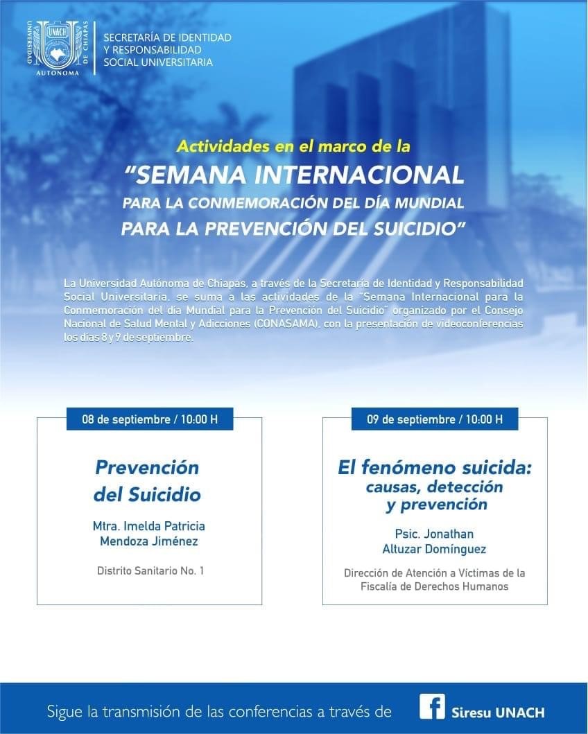 Por ello, a través de la Secretaría de Identidad y Responsabilidad Social Universitaria (SIRESU), invita a conmemorar el Día Mundial para la Prevención del Suicidio, a través de dos videoconferencias los días ocho y nueve de septiembre del 2021.