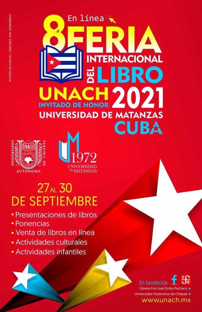 Tuxtla Gutiérrez, Chiapas; septiembre 20 de 2021.- La Universidad Autónoma de Chiapas organiza la Octava Feria Internacional del Libro UNACH 2021, que se realizará del 27 al 30 de septiembre, de manera virtual, atendiendo las recomendaciones sanitarias emitidas por las autoridades correspondientes.