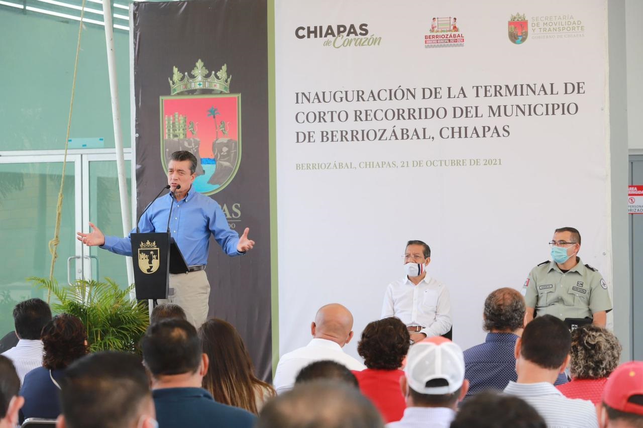 Tuxtla Gutiérrez, Chiapas; 21 de octubre de 2021.- Durante la reinauguración de la Terminal de Corto Recorrido de Berriozábal, el gobernador Rutilio Escandón Cadenas expresó su respaldo a las y los transportistas federales de este municipio, quienes, gracias a la suma de esfuerzos, hicieron posible la construcción de esta terminal que genera 70 empleos directos y 40 indirectos, y beneficia a 11 mil usuarios.