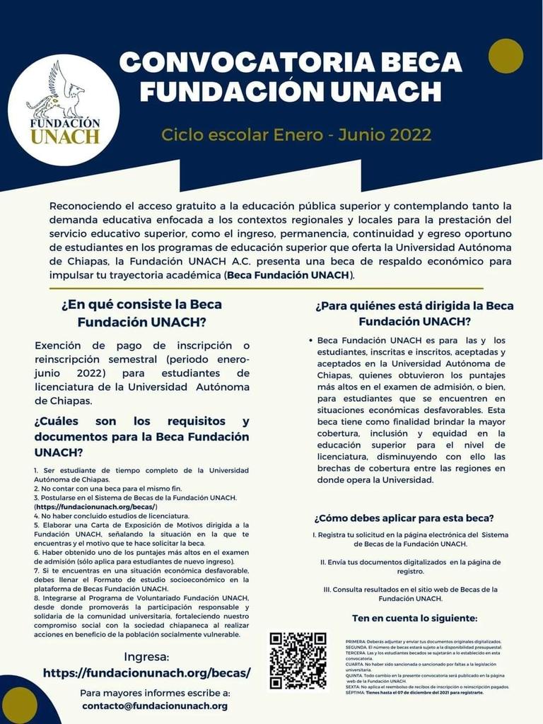 Tuxtla Gutiérrez, Chiapas; octubre 15 de 2021.- Con el propósito de brindar mayor cobertura, inclusión y equidad en la educación superior para los niveles de licenciatura e ingenierías, disminuyendo con ello las brechas que puedan existir entre las regiones en donde se cuenta con oferta académica por parte de la Universidad Autónoma de Chiapas, esta institución lanza la Beca Fundación UNACH.