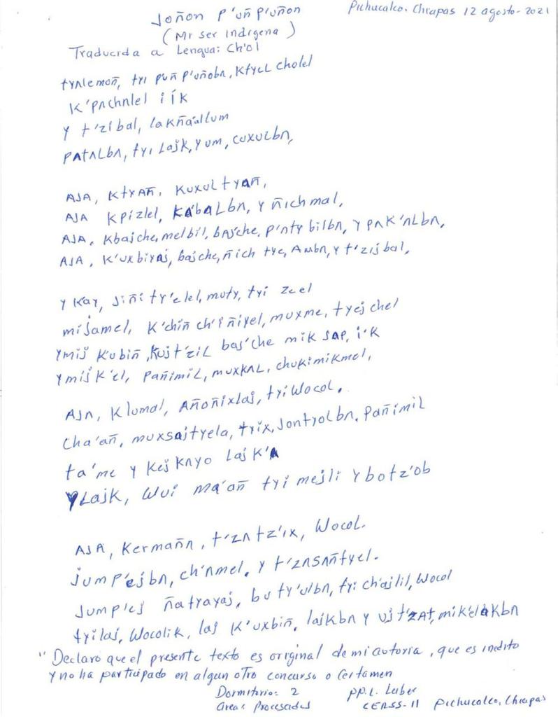 Tuxtla Gutiérrez, Chiapas.- Luber "N", persona privada de la libertad en el Centro Estatal de Reinserción Social para Sentenciados (CERSS) número 11 de Pichucalco, obtuvo el primer lugar en el XXVI Concurso Nacional de Poesía "Salvador Díaz Mirón" 2021 en lengua indígena.