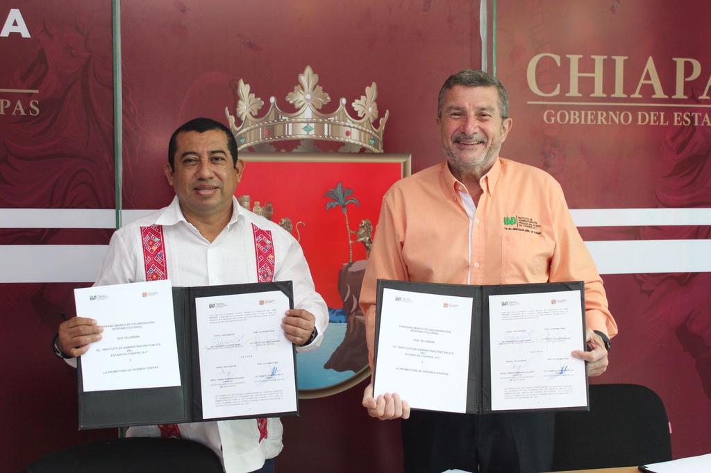 17/11/2021.- Con el objetivo de promover y fortalecer la profesionalización de las y los servidores públicos de la Promotora de Vivienda Chiapas (Provich), su titular Freddy Escobar Sánchez y el presidente del Consejo Directivo del Instituto de Administración Pública del Estado (IAP), Fernando Álvarez Simán, firmaron un convenio marco de colaboración interinstitucional.