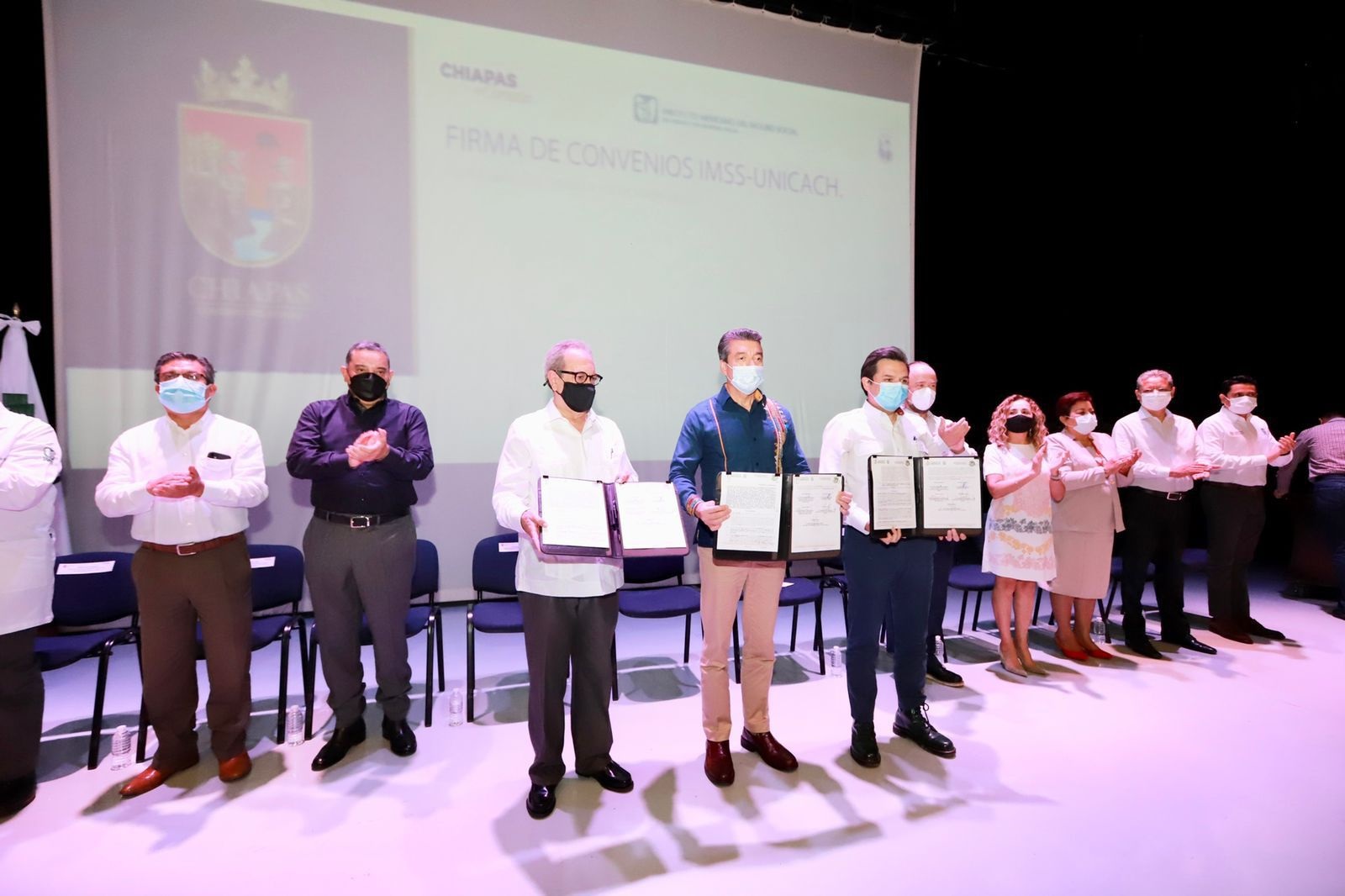 El titular del IMSS añadió que con la firma de estos convenios se otorga certeza en el porvenir de las trabajadoras y los trabajadores de esta universidad, lo cual fue posible gracias a la corresponsabilidad de la Unicach, porque pagó con el apoyo del Gobierno de Chiapas el 20 por ciento de los adeudos, un total de 34 millones 846 mil pesos.