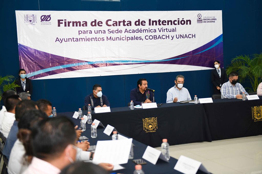 Tuxtla Gutiérrez, Chiapas; diciembre 14 de 2021.- Para continuar con la estrategia que permita acercar la educación superior a más municipios de Chiapas, el rector de la UNACH, Carlos F. Natarén Nandayapa, el director General del COBACH, Jorge Luis Escandón Hernández y distintos ayuntamientos, firmaron una Carta Compromiso para el establecimiento de sedes académicas de Universidad Virtual en distintas regiones de la entidad.