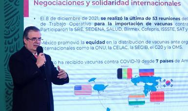 Ciudad de México, 14 de diciembre de 2021.- En el marco de la conferencia de prensa matutina que encabeza el presidente Andrés Manuel López Obrador, el secretario de Relaciones Exteriores, Marcelo Ebrard Casaubon, presentó los logros de la estrategia, instruida por el presidente de la República, para garantizar el acceso oportuno de México a las vacunas contra COVID-19.